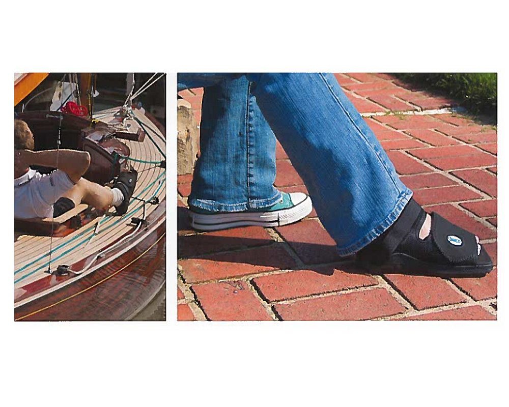 Very aggressive tread at the midfoot provides superior traction. The reduced-friction tread at the toe and heel helps accommodate toe drag and heel scuff, minimizing the risk of accidental tripping. The elastic strap around the front of the ankle prevents the product from slipping off the heel. The DARCO MedSurgâ„¢ has a rocker bottom sole which is designed to reduce pressure on the bottom surface of your foot by up to 25% for a more comfortable walking experience.